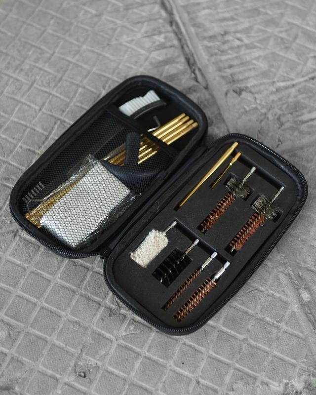 Состав набора: - шомпол с 4-мя насадками - 2 медные щетки - 2 ершика для чистки патронника - пушек - вешалка - щетка пластиковая - зацеп - йорж нейлоновый - вешалка - салфетка