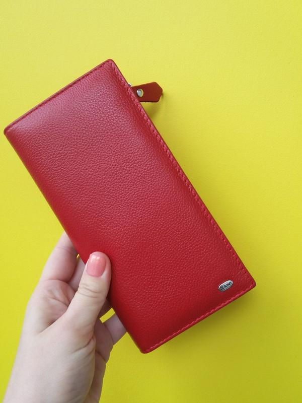 Изготовлен из мягкой натуральной кожи. Переднее отделение закрывается на магнитные кнопки. Внутри находятся 12 карманов для визитных карт и один большой открытый карман. Двойное отделение для банкнот с карманом-монетницей на молнии, закрывается на общую молнию. Размер (см.) 10*19*3