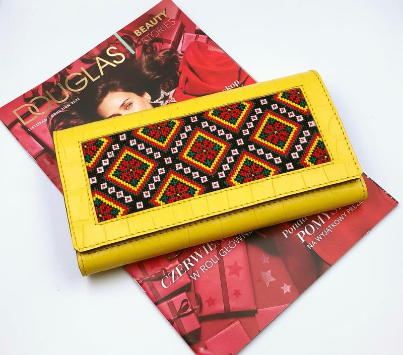 Елегантний та водночас стильний гаманець з вишивкою ручної роботи. Гаманець закривається на магнітні фіксатори, має достатньо відділень для зберігання грошей, карток та дрібних. Розмір: 20*10*2 см. В наявності: в жовтій шкірі. За побажанням з даним орнаментом модель гаманця можемо пошити в чорній або білій шкірі. Переходьте та підписуйтесь на нашу сторінку, де представлені інші шкіряні вироби з ручною вишивкою.