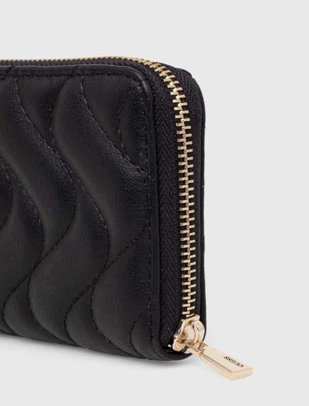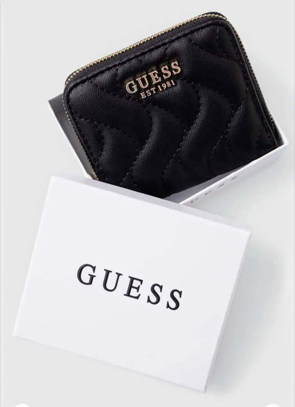 Маленький стьобаний гаманець бренду GuessМатеріал: штучна шкіраКолір: чорний із золотою фурнітуроюЄ відділення для банкнот, карток та монетРозмір: 11,5 ×9,5 смУ фірмовому пакуванні