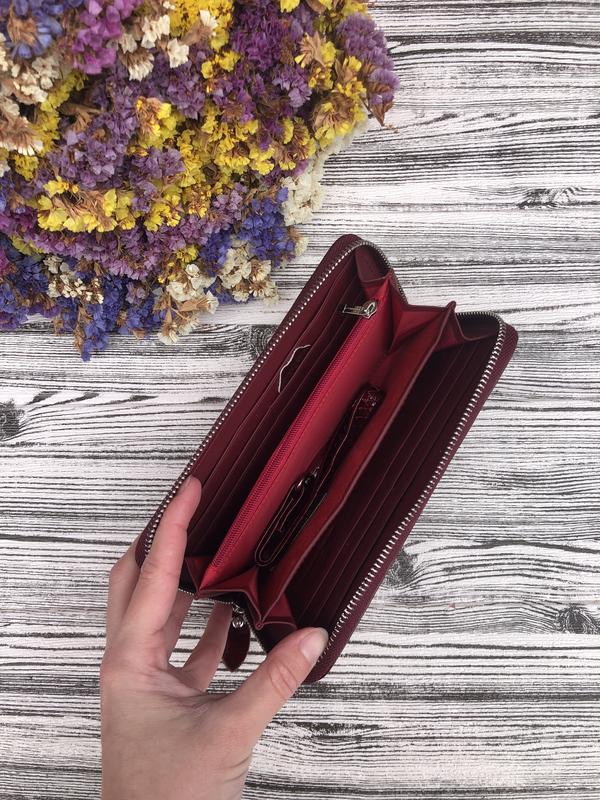 Закривається на блискавку. Усередині 3 відділення для банкнот, відділення для дрібниці на блискавці, дві великі відкриті кишені, 8 кишень для карток та візиток. У комплекті є ремінець на руку.