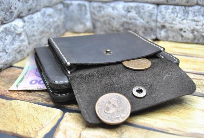 Вертикальний гаманець з відділом доя дрібниці з натуральної шкіри ручної роботи. Гаманець виготовлений з натуральної шкіри crazy horse товщиною 1,4-1,6 мм і зшитий 1 мм ниткою. Виріб має 1 відділ для купюр, 4 відділу для карт, 2 відділу у вигляді вікон для пластикових документів, 2 кишені для автодокументів старого зразка, закривається на кнопку. Колір шкіри і нитки можна вибрати з асортименту. Розмір гаманця в закритому вигляді 13 см*10 див.