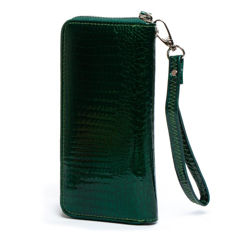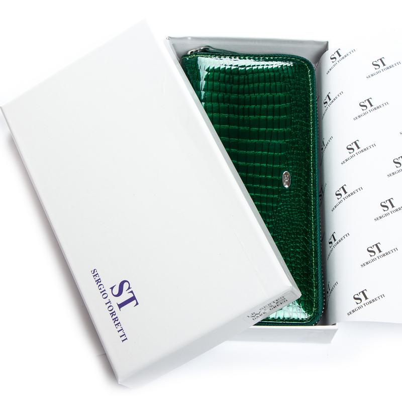 Великий жіночий кошелек-клатч Sergio Torretti. Зовнішня частина - лакова шкіра, внутрішня частина - натуральна м'яка шкіра. Закривається на блискавку. Усередині 3 відділення для банкнотів, відділення для дрібниці на блискавки, дві великі відкриті кишені, 8 кишень для карт і візиток. У комплекті кистьовий ремінець.