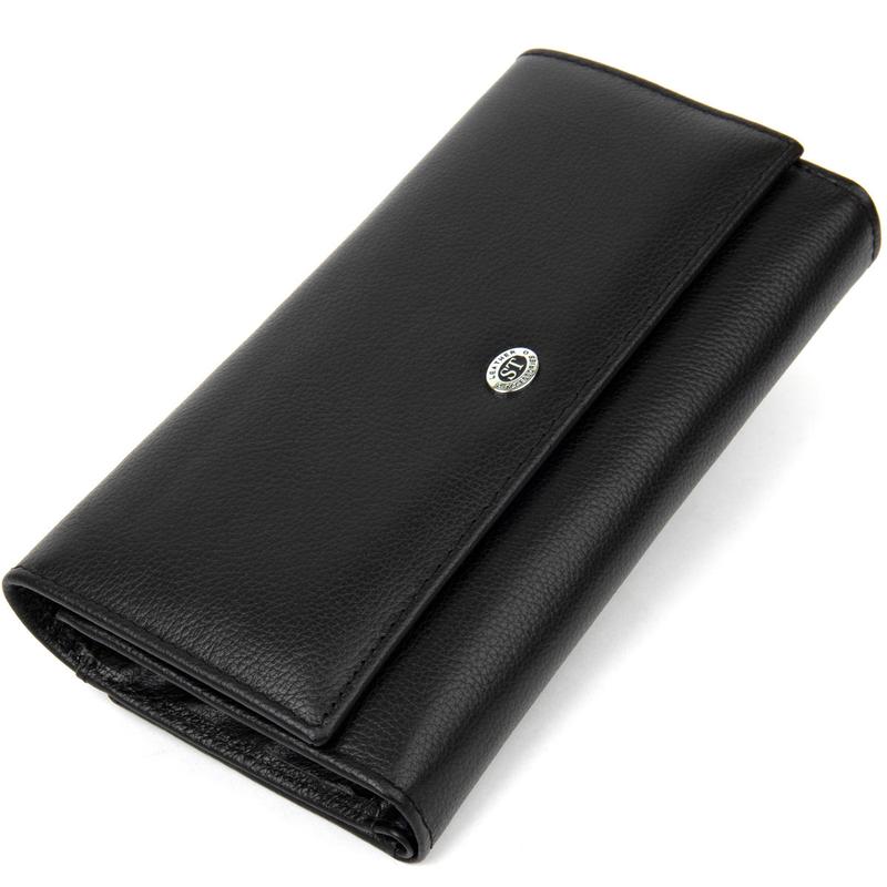 Матеріал: натуральна шкіра. Колір чорний. Розміри (ШхВхГ, см): 19х10х3 см. Країна виробник: Китай. Бренд: ST Leather. Опис: - основне відділення закривається на два магніти; - всередині розташовано чотири великих відділення для купюр по всій довжині; - одне відділення на всю довжину для інших цінних речей; - 2 відділення на блискавках; - 4 кишень для карток; - на зовнішній стороні розміщені слоти для карт 10 шт; - відділення на всю довжину гаманця; - прозора кишенька; - слоти закриваються на хлястик з кнопкою, яка регулює обсяг його наповнення; Якщо Ви прихильниця класики, то даний гаманець саме те, що Ви шукали. Він зроблений в універсальному чорному кольорі з високоякісної шкіри, має зернисту матову фактуру. Усередині знаходяться місткі відділення для купюр, монет і карт. Дана модель - це поєднання моди, практичності і високої якості.