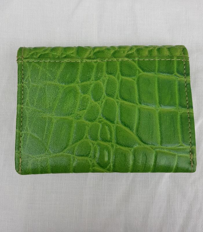 Компактний шкіряний гаманець під крокодилячу шкіру з красивою підкладкою. Розмір: 8×10,5 див. Усередині три відділення, одне з них на блискавці. Зовні на задній стінці ще одне відділення. Підходить для карток і монет, купюри потрібно буде складати навпіл. Стан відмінний, лише трохи потерт по краях бантик і на згинах злегка.