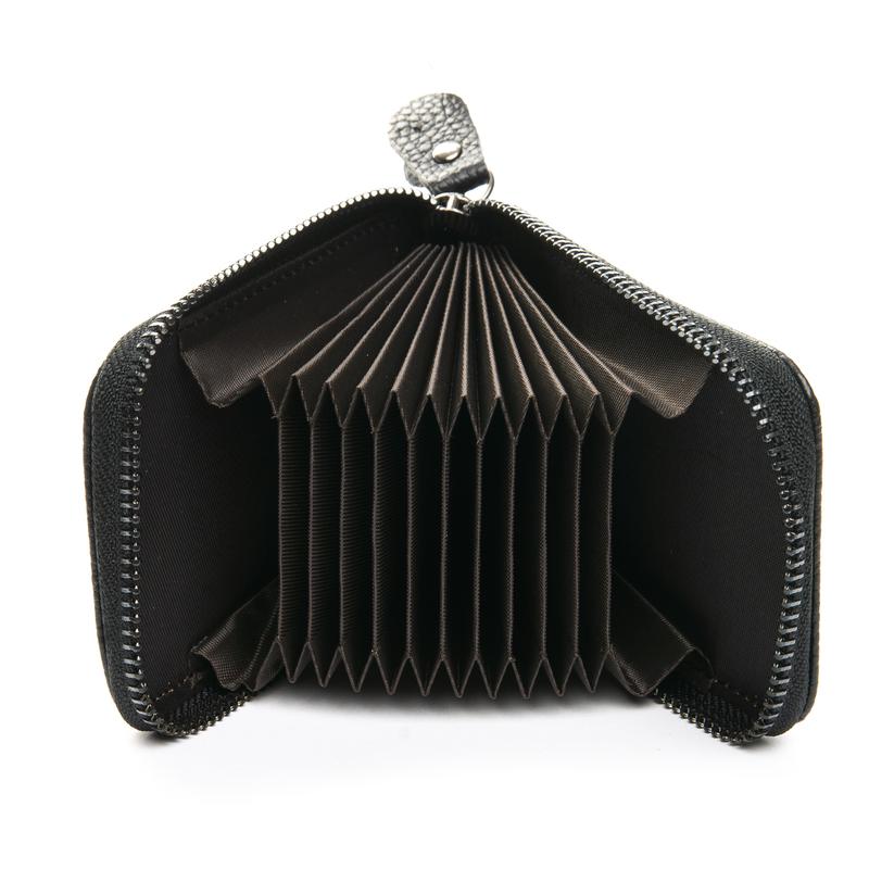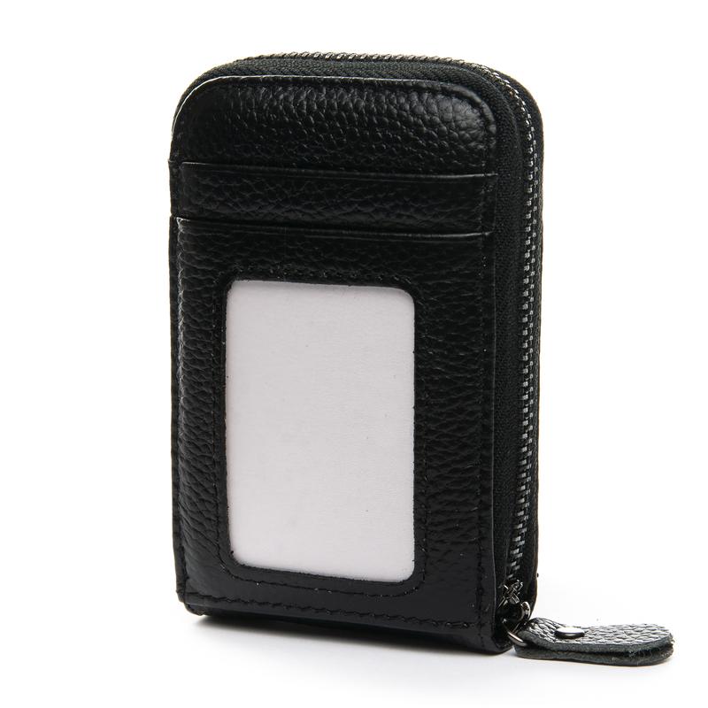 Жіноча візитниця, виготовлена з натуральної шкіри. Закривається на блискавку. Усередині знаходяться 12 відділень для візитних карток. Зовні візитниці є два відкритих кишені, один з яких виконаний прозорим. Розмір (див) 11,5 * 7,5 * 3 Артикул: H862-1