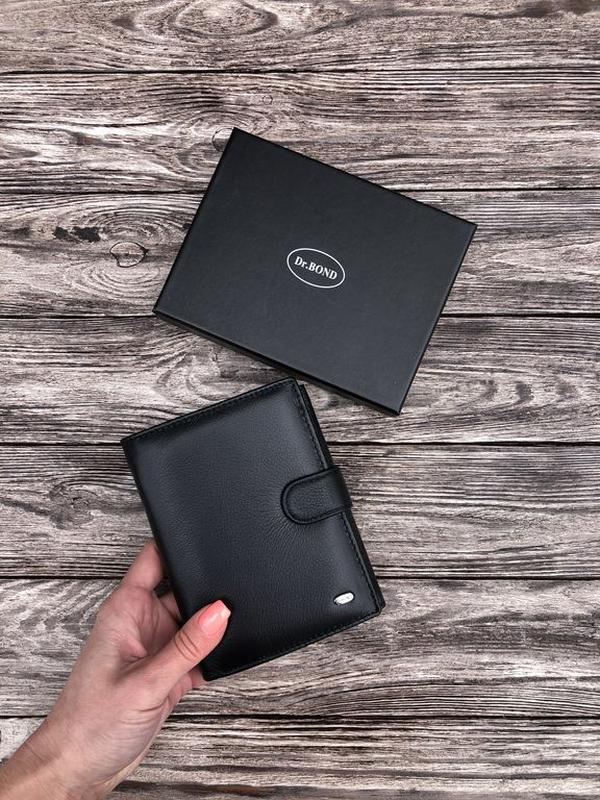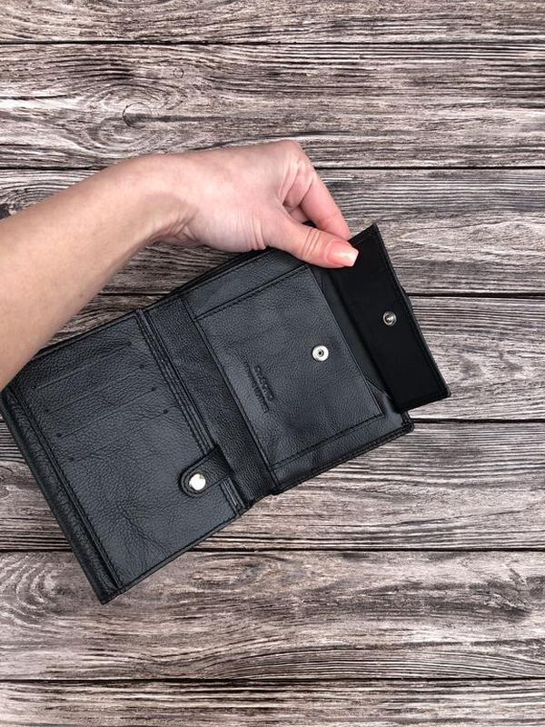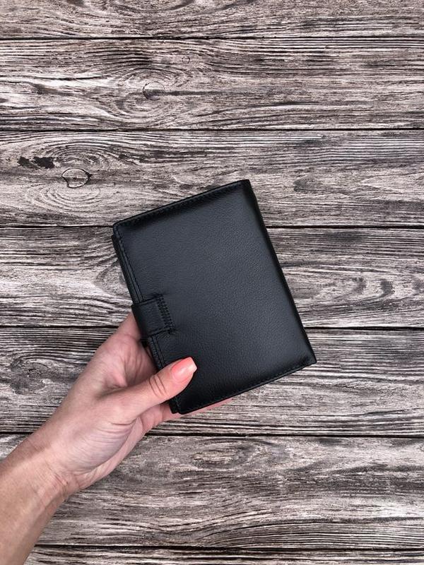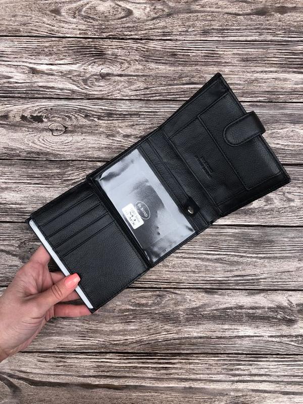 Вертикальне портмоне з натуральної шкіри з 2 відділеннями під банкноти (1 змійка), усередині - відкидний блок з правником, що застібається клапаном, відділення для дрібниці, 5 великих кишень, 8 кишень під карти. Розмір (см) 10,5*14*2