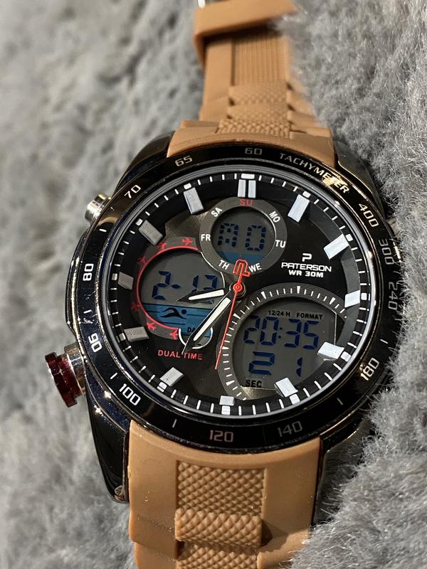 Годинник майже новий. Водонепроникний до 30 метрів. Є підсвітка, будильник, секундомір. Ремінець коричневого кольору Виробник Paterson. Продаю бо лежить Коробка втратилась підчас переїзду