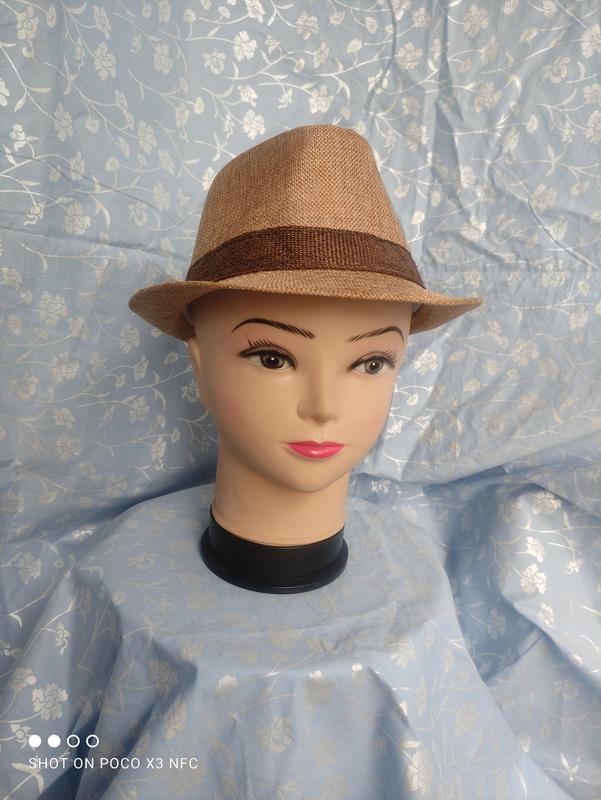Капелюх з вузькими полями і стрічкою. Новий. На об'єм 56 - 58 див. Склад по бірці 95% папір, 5% поліестер. Додаткові заміри надам. Повернення немає.