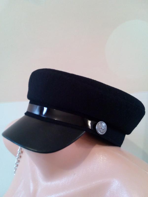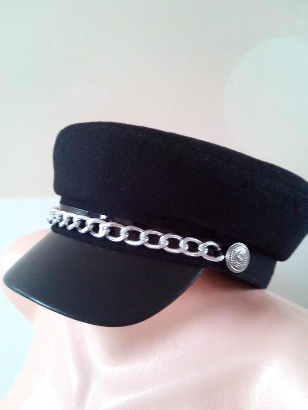 Дана модель виконана з італійського кашеміру з козирком з натуральної шкіри, а декор виконаний у вигляді лакового ремінця і знімною ланцюжка.