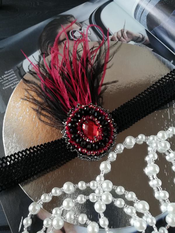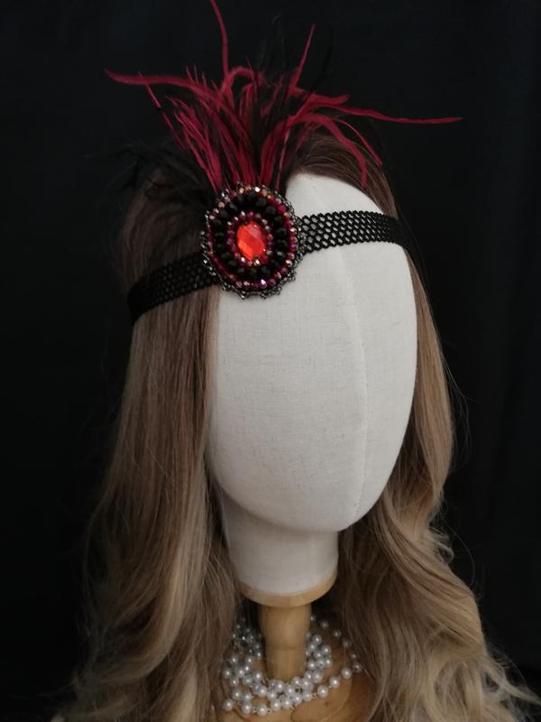 Пов'язка в стилі Гетсбі. Для вечірок, фотосесій. Ручна робота. Вишивка. Ексклюзив. Колір чорний, червоний. Сзаду натуральна шкіра.