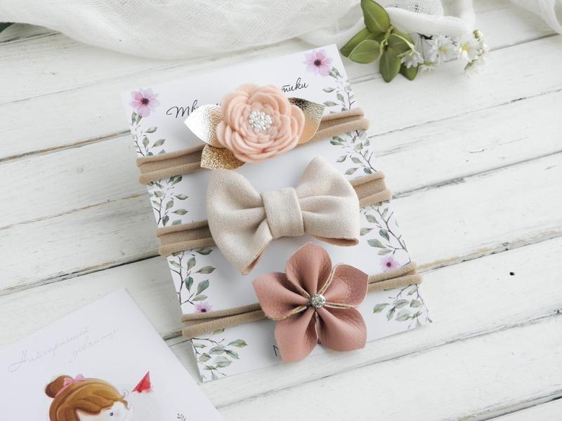 В наборі 3 пов'язки: з квітами і бантиком. Серединка верхнього квітки розшита намистинами і бісером. У середині нижнього квітки стразики. Бантик з замша. Це відмінний варіант для подарунка.