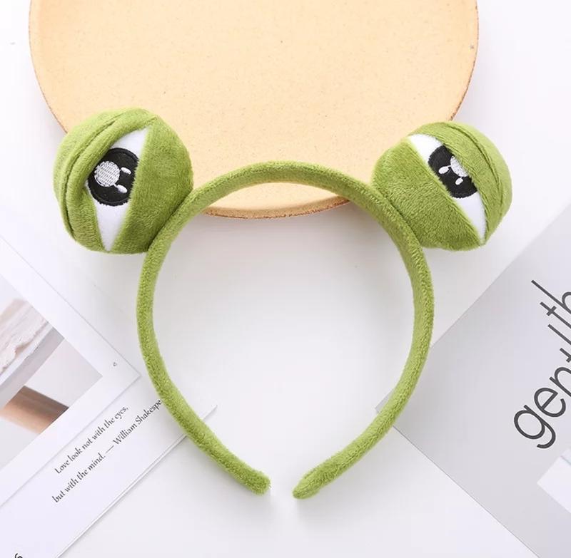 Пов'язка, обруч і маска для сну у вигляді жабеня Пепе з вічками 3D ідеально підійде для фотосесій, святкових заходів, нанесення або зняття макіяжу і т. д. Симпатичні очі жаби можуть підморгувати, їх можна закрити або відкрити вручну. Один універсальний розмір підходить для всіх. Матеріал - плюш. Колір - зелений.