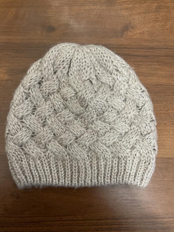 Бежева з серебристою ниткою в’язана шапка жіноча