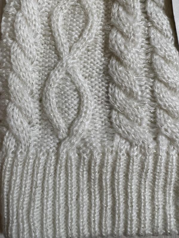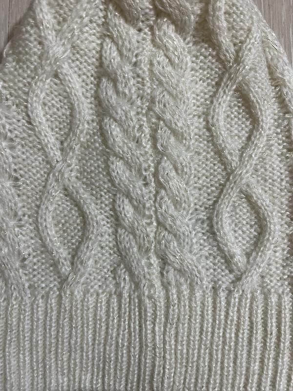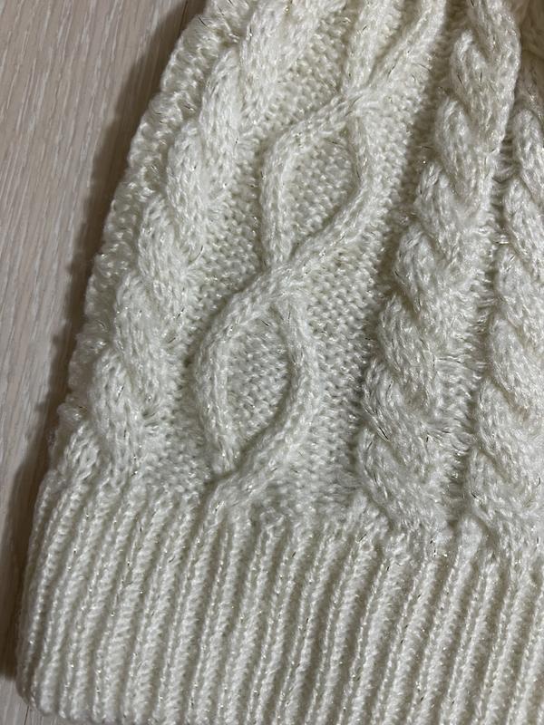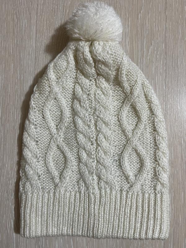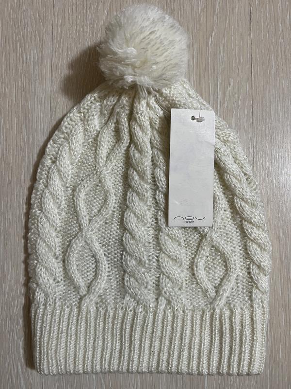 У наявності красива шапка фірми NEW LOOK. Склад: 97% поліестер і 3% золота нитка... Нитка м'яка та приємна до тіла. Довжина без бубону — 27 см, з бубоном — 31 см, ширина — 21 см + дуже добре тягнеться.