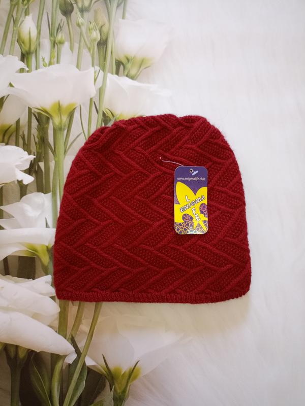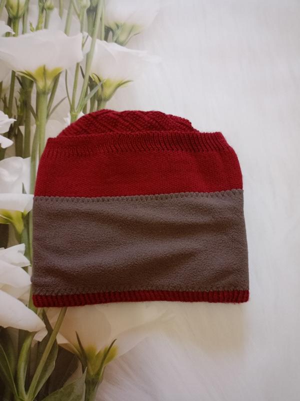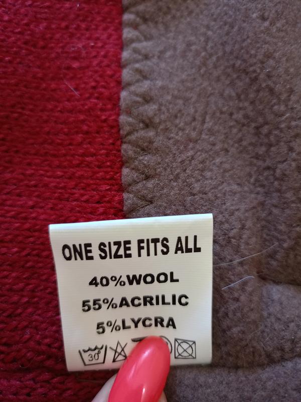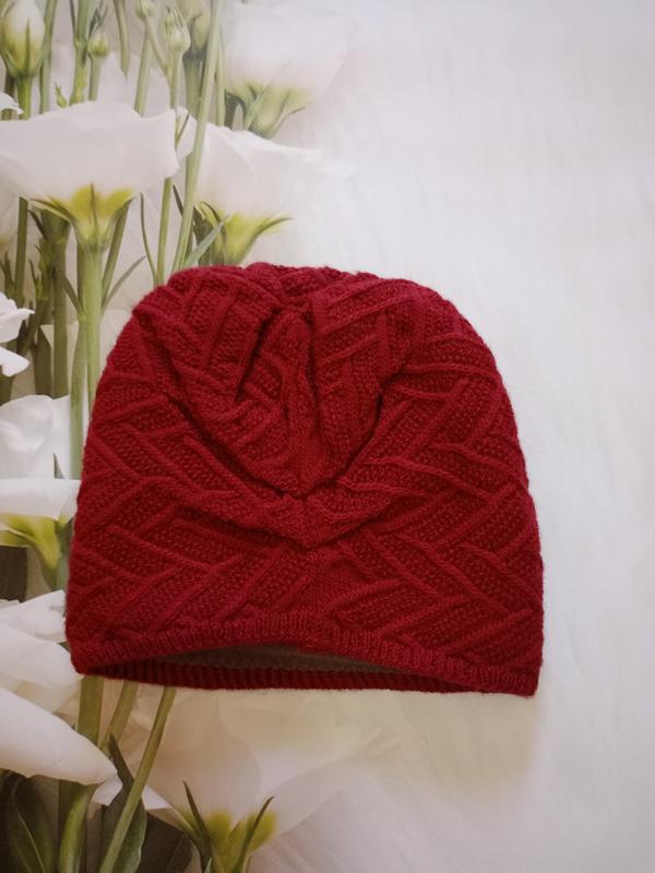 В'язана тепла шапка.Глибина - 22 см. Ширина - 23 см., тягнеться до 28 см.Утеплювач фліс.Колір такий як на останньому фото.