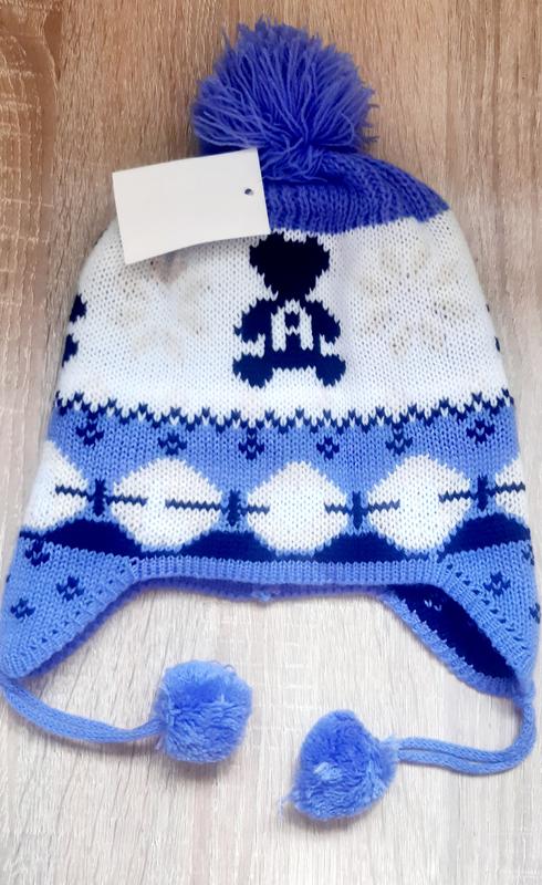 Дитяча тепла шапка з помпоном, вушками із зав'язками, всередині підкладка із флісу. Матеріал: 100% акрил, дуже м'яка, не колеться, не викликає алергічних реакцій