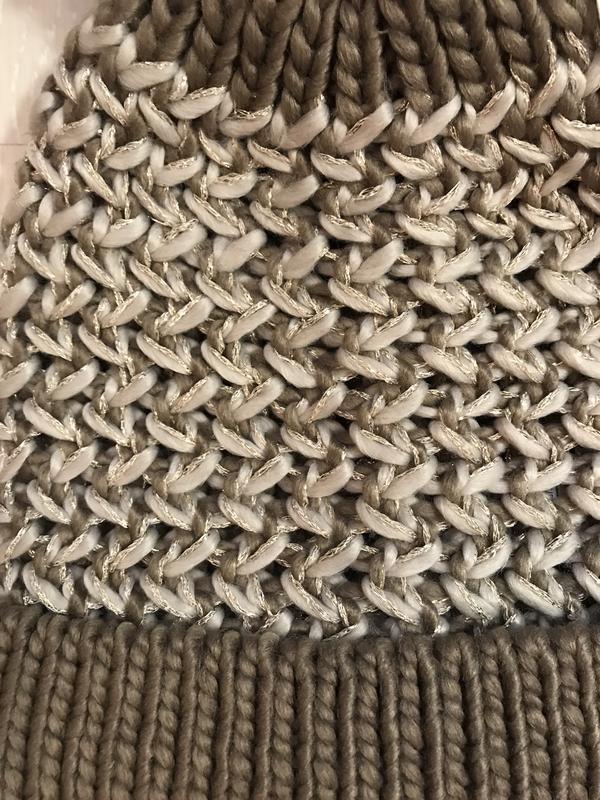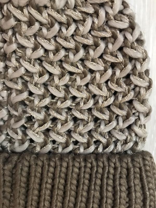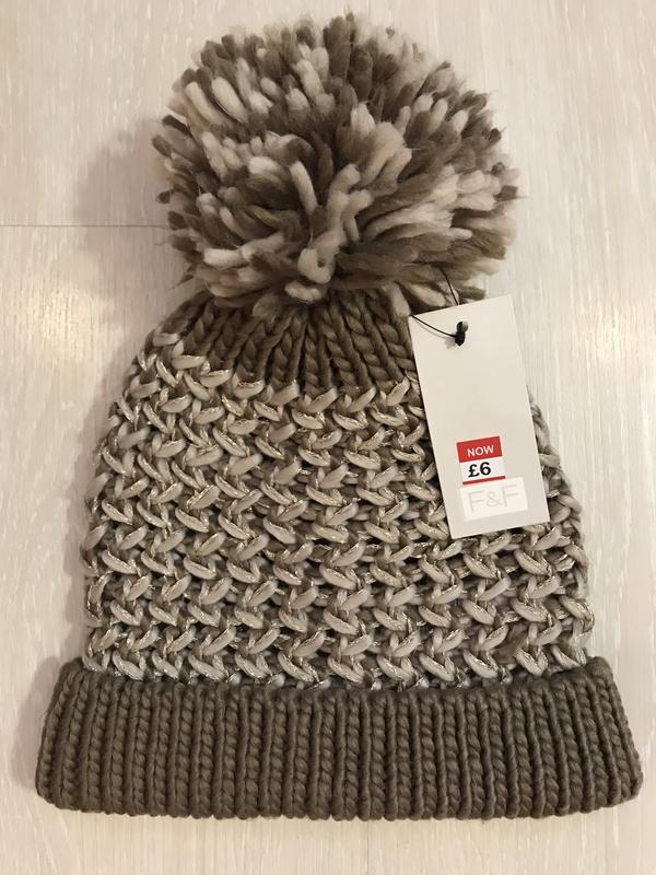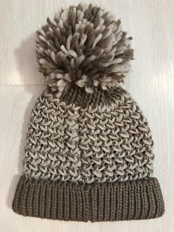 У наявності красива шапка фірми F&F. Довжина без бубону — 24 см, з бубоном — 31 см, ширина — 24 см + добре тягнеться. Склад: 94% акрил, 4% поліестер і 2% металік..нитка м'яка, тепла та приємна.