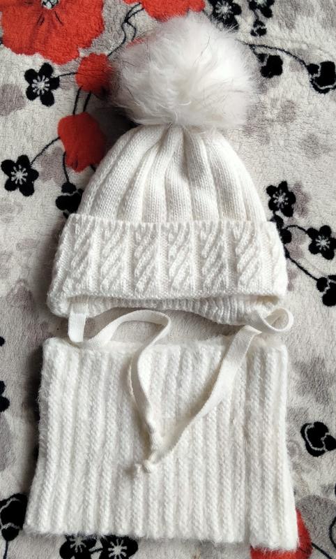 Шапка та хомут біло-молочного кольору. Зимовий комплект в ідеальному стані, розмір 52. На вік 3-5 років. На відвороті шапки є дрібні перлинки.