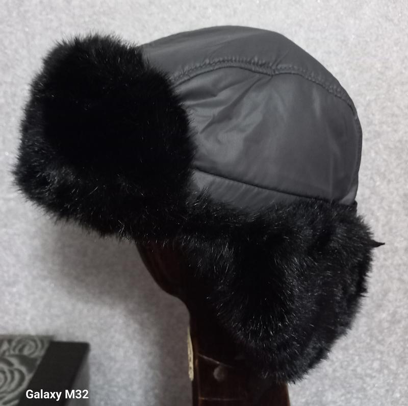 Шапка- ушанка зимняя. Верх- водонепроницаемый текстиль ( плащевый ). Внутри искусственный мех. Цвет меха- чёрный, цвет плащевки- серый.