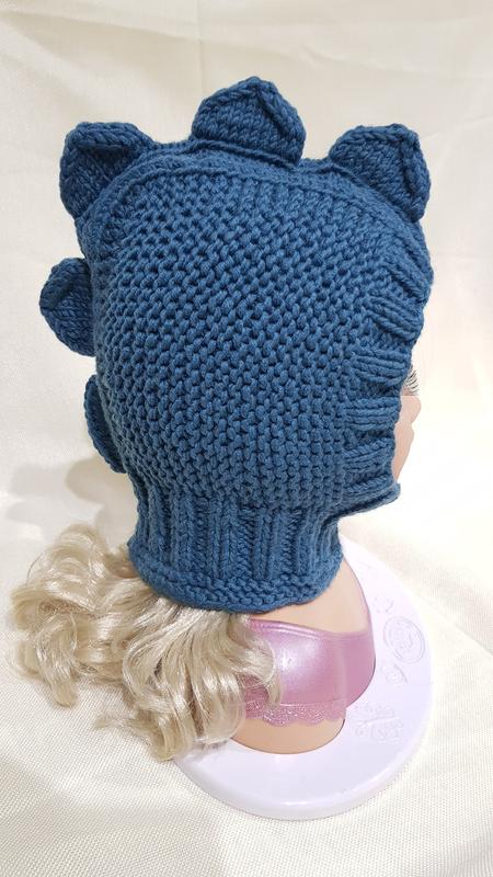 Дитяча в'язана вручну тепла шапочка (шапка, шолом, балаклава, капор) У стилі Діно (Дракон, Дракоша, Динозавр, Динозаврик) осіння для хлопчика. Чудово тягнеться по ширині. Не колеться, приємна до тіла. В'язана без підкладки. Пов'язана вручну з італійської пряжі 100% меринос.