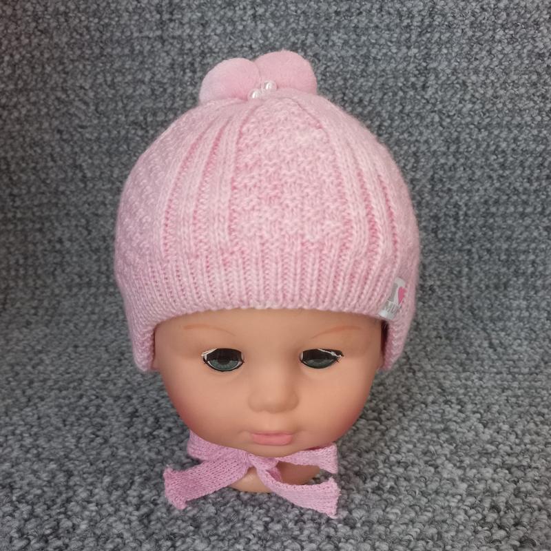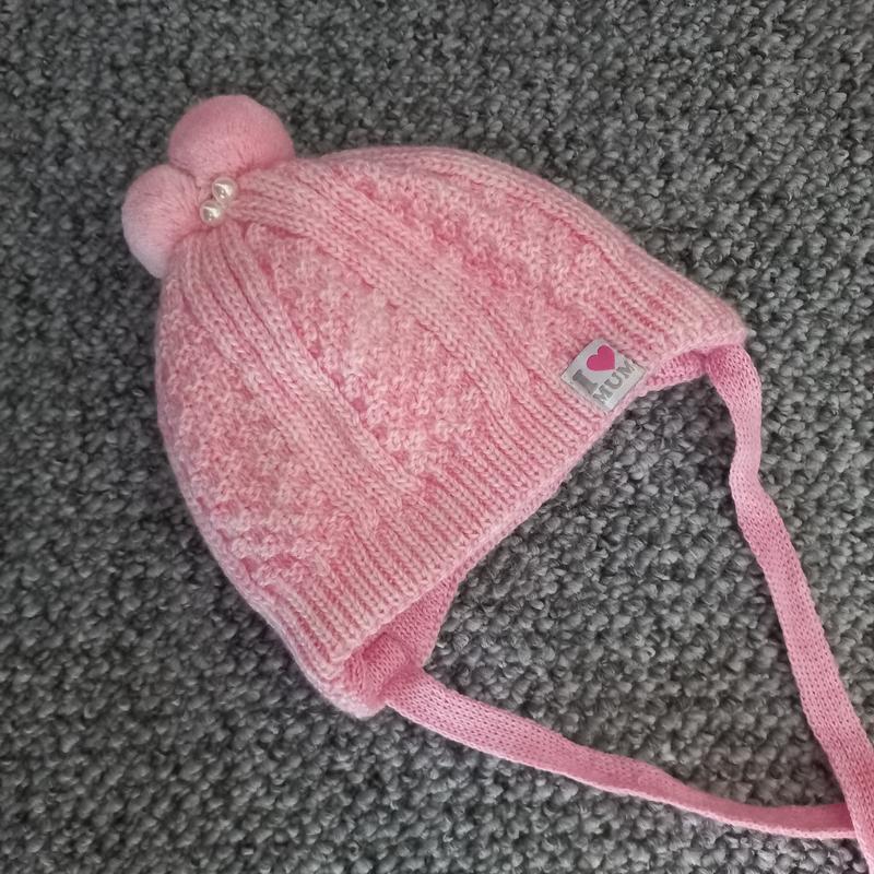 Назва: Дитяча зимова в'пов'язана махрова шапочка на зав'язках для