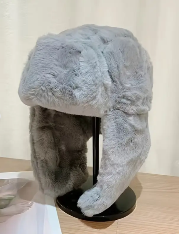 Жіноча зимова шапка з плюшевого штучного хутра Колір бежево-сірий ЇЇ можна носити різними способами (вуха вниз, наверх, назад скріплювати) Виглядає стильно, красиво, в ній тепло та комфортно Розмір 55-58