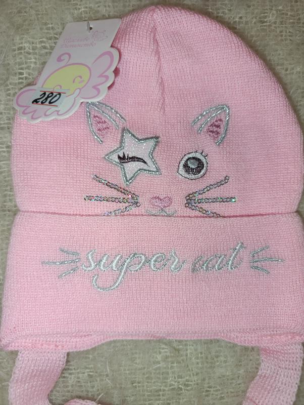 Нова дитяча шапка, на підкладці, з біркою 💕 Котик - якісна вишивка🐱 На 3-6 місяців Акрил з бавовною 📌 16 х 17 см