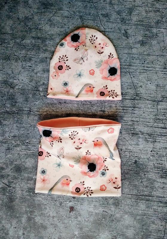 Красивий і яскравий комплект на весну/осінь. Мила шапочка з пташками і снудик. Матеріал - трикотаж (футер) 95% бавовна. Всередині бавовняна підкладка або просто подвійна. Якість відмінна, довго зберігає колір. Шапочку можна придбати без снуда. Розміри: 42-44, 44-46, 46-48, 48-50