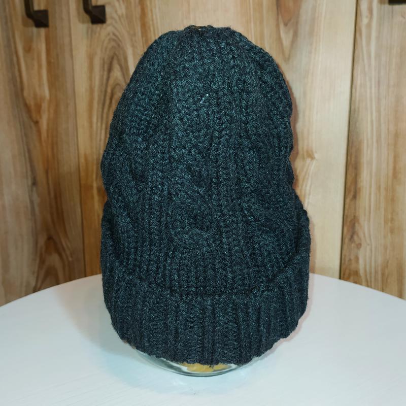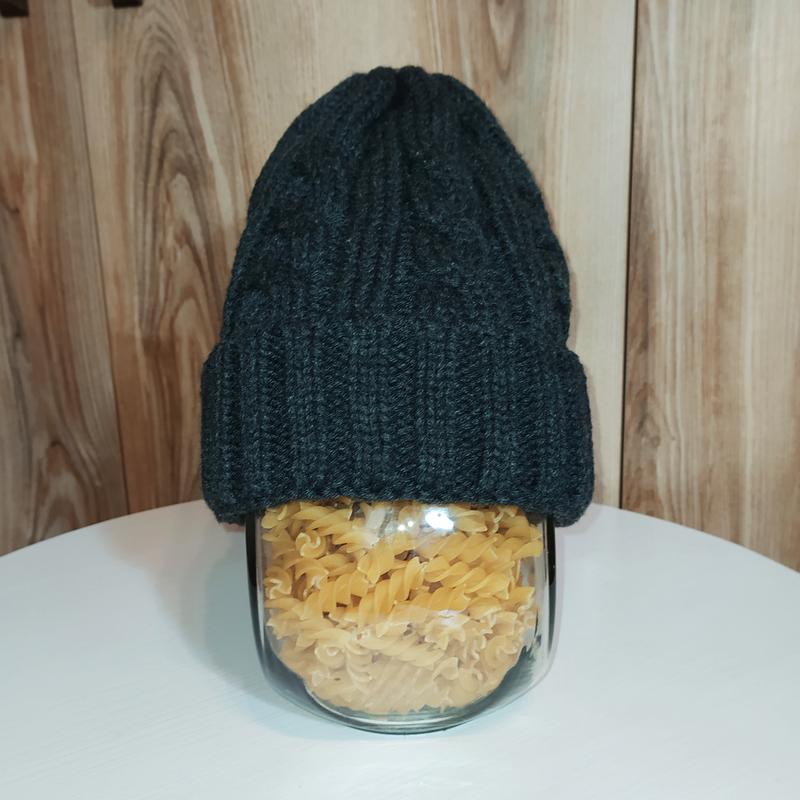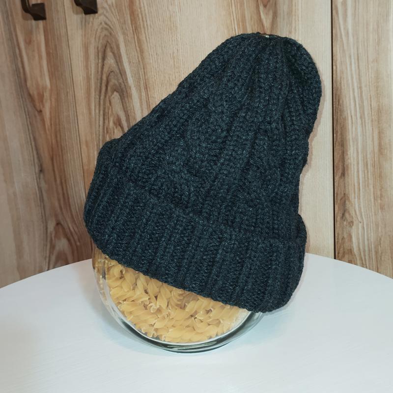 Темно сірий графіт чорна в'язана утеплена шапка з хутряною помпоном