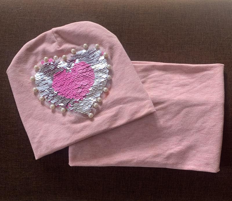 Набір шапочка і хомут. весна ,2-4 роки Сердечко з паєтками -перевертнями