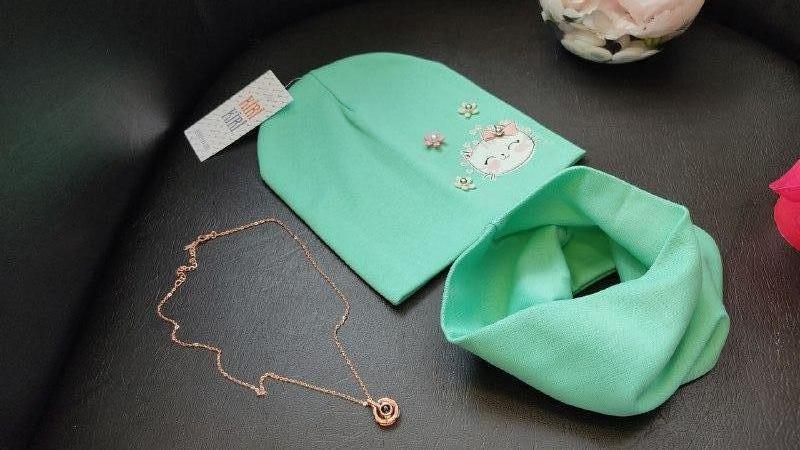 Милий дитячий демісезонний комплект з кішечкою (шапка + хомут). Прекрасно підійде для дівчинки 1-2 рочки на весну / осінь. Шапка і шарф-хомут з подвійного трикотажу добре тягнуться і зручно сидять. Склад: бавовна 95%, еластан 5% Розмір: 46-48 (1-2 роки) Виробництво м Харк ів, Україна Рекомендації по використанню: прання бажана навиворіт при температури до 30 ° С