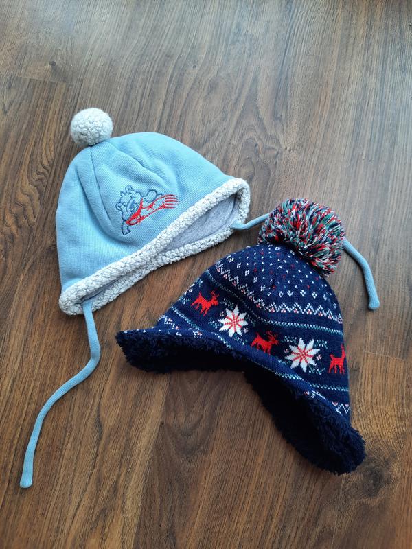 Две шапочки, голубая размер 46, плотная на осень и шапка ушанка очень теплая на зиму Lc-Waikiki для новорожденных.