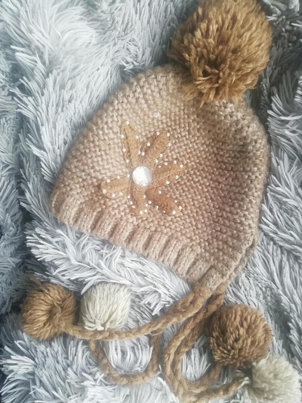 Дуже круто виглядає! Схожих ніде немає! Велика пухка в'язка Без підкладки Зав'язки з помпонами Носилася недовго, ніяких слідів і дефектів Гумка 26х2см Довжина по центру до помпона 28см Зав'язки 27см