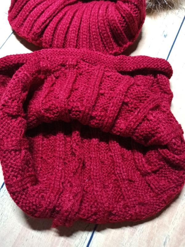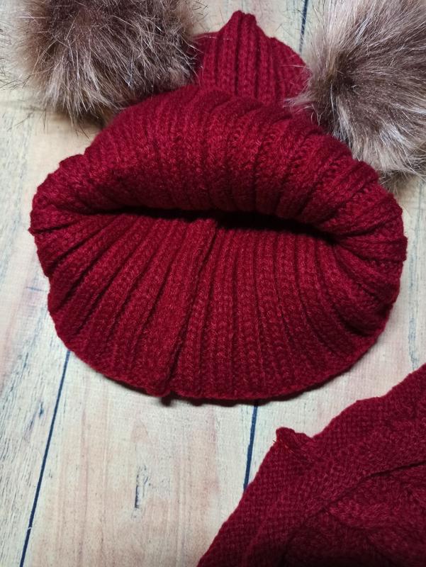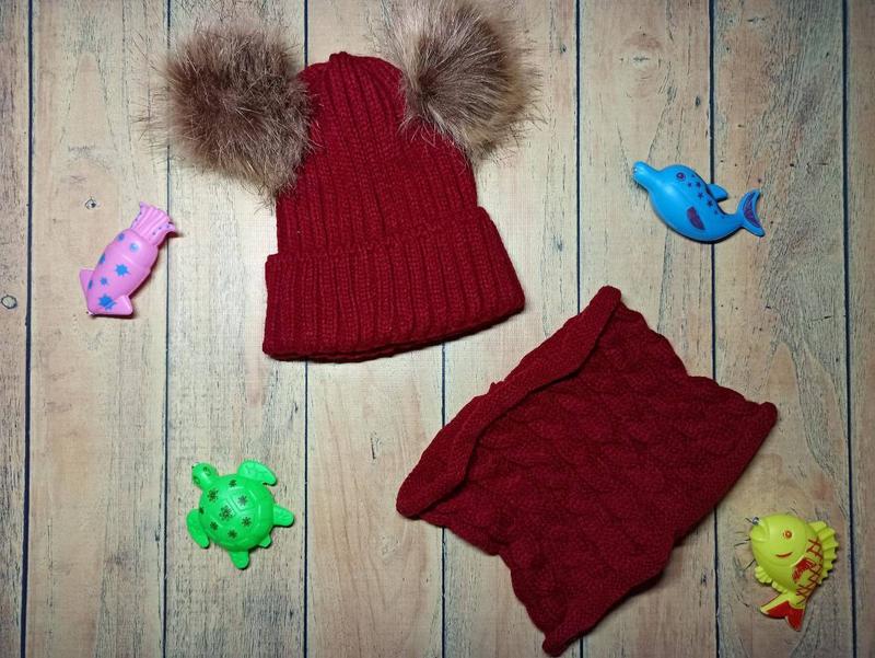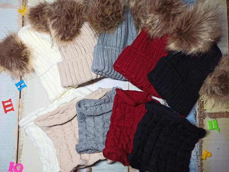 Вязанный набор шапка+хомут для малышей, комплект вязанный шапка с помпонами и хомут