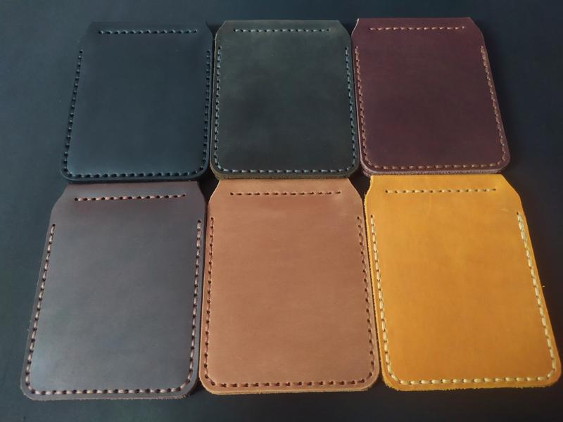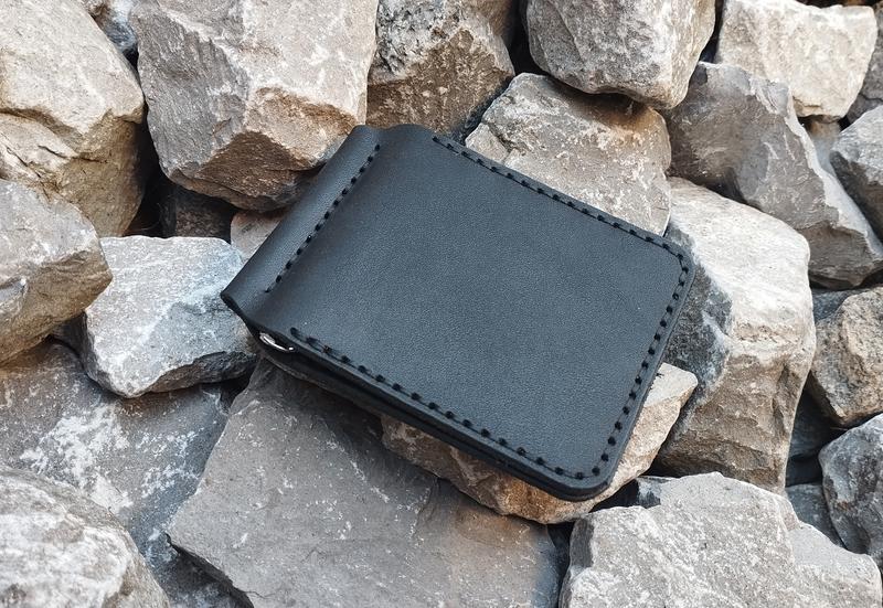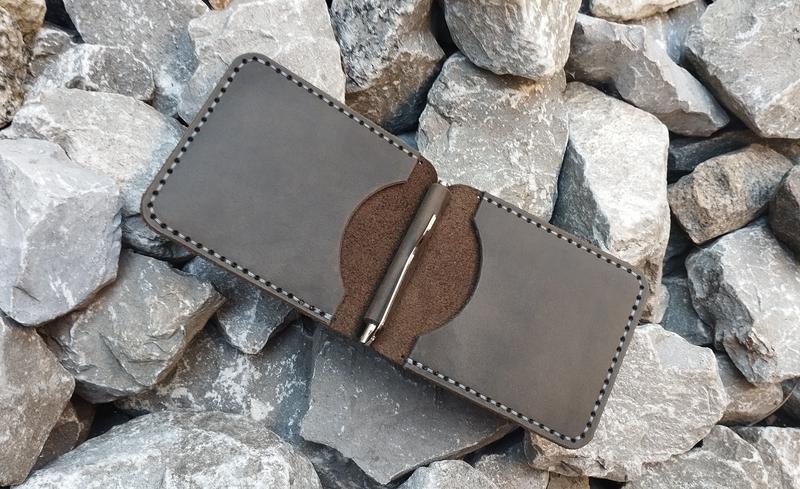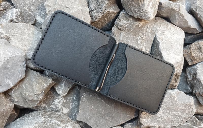 Затискач для грошей з натуральної шкіри ВРХ товщиною 1,8-2 мм, прошитий плоскою, вощеною ниткою. Має місце для купюр і дві кишені для карток. Розмір: 8,5*11,5 смКолір: чорний, олива, темно-коричневий матовий