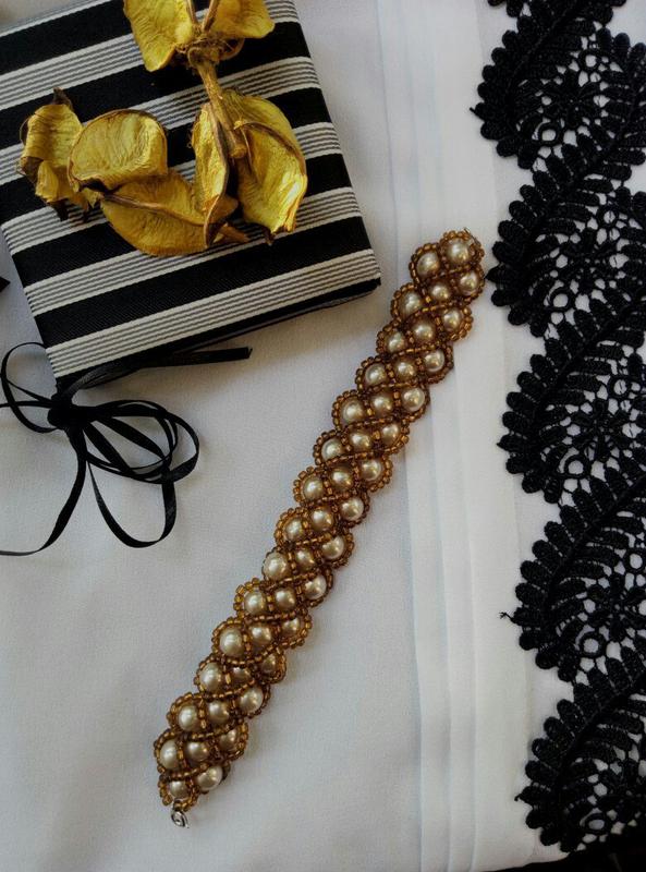 Ексклюзивний браслет з бус та оздоблений додатковими хвилями бісеру. Достатня масивного виконання. Довжина становить 19 див. Можливе замовлення іншого кольору та + таке ж кольє.