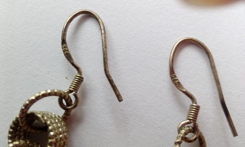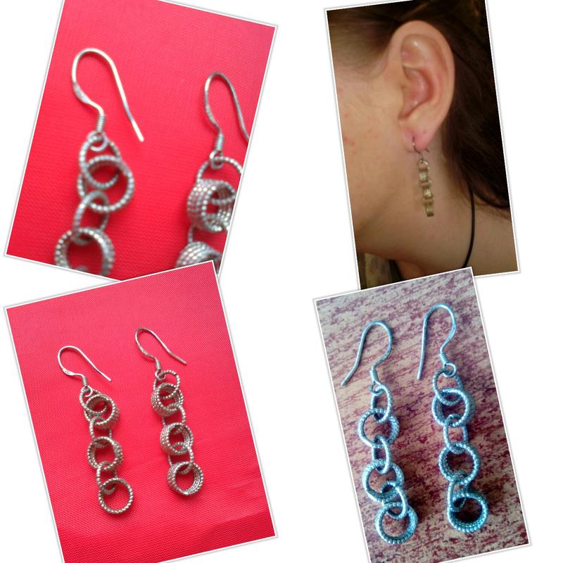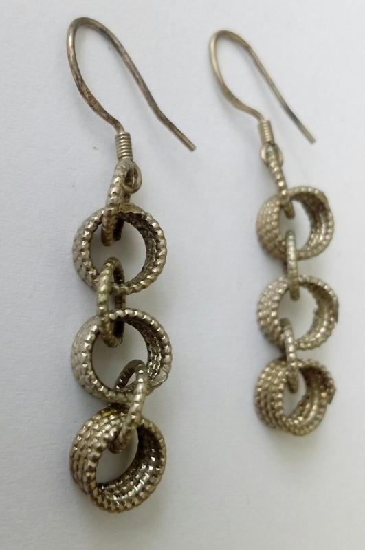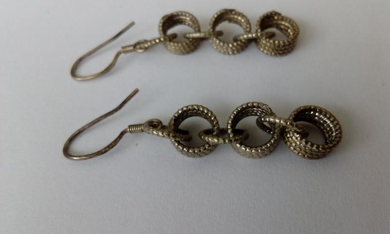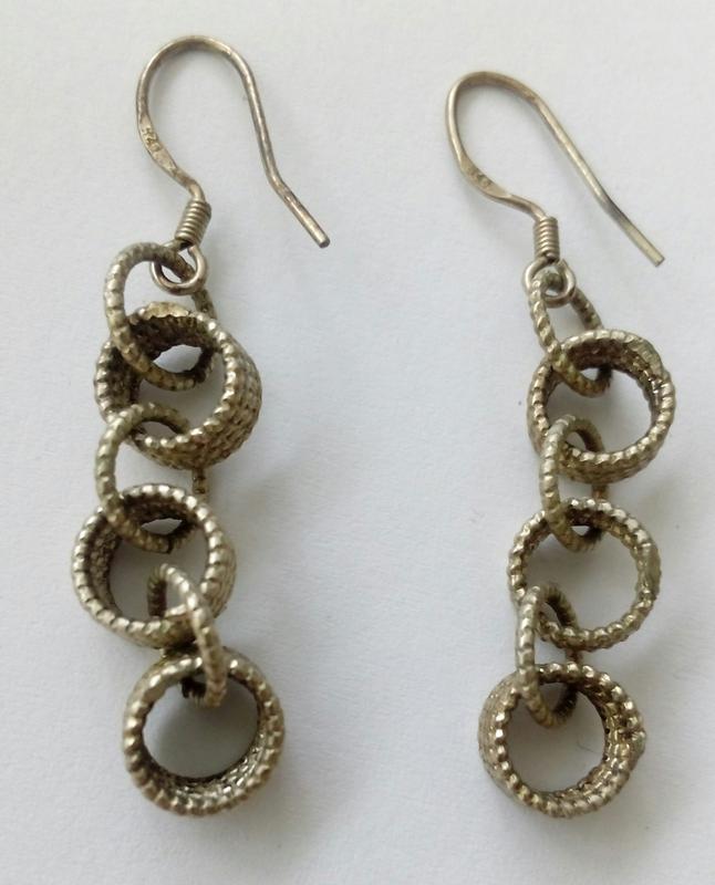 Стерлінгове срібло, сережки у вигляді кілець, з'єднаних між собою вага 3,92 гр., довжина з вушками-гачком 5 див. Пересилаю.