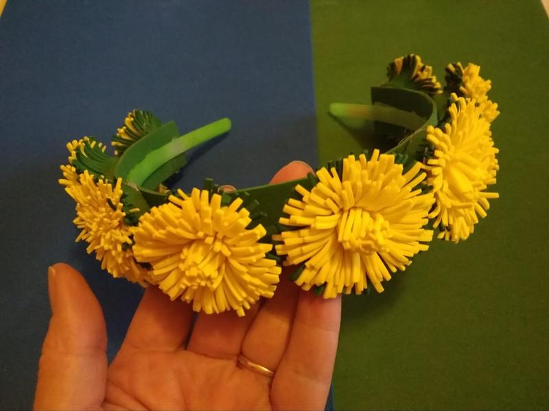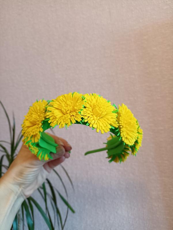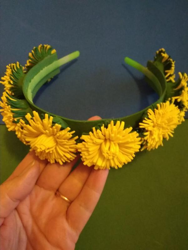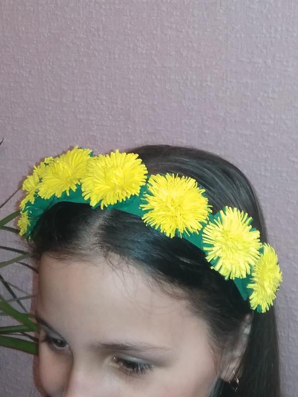 Обруч на волосся віночком до костюма кульбабка. Дівчаткам в садочок на свято весни, або для фотосесій. Яскравий і легенький розквітлі квіточки й пуп"янки мають реалістичний вигляд. Також дивіться мої пишні жовті фатінові спіднички в комплекті з обручем буде гарний костюм.