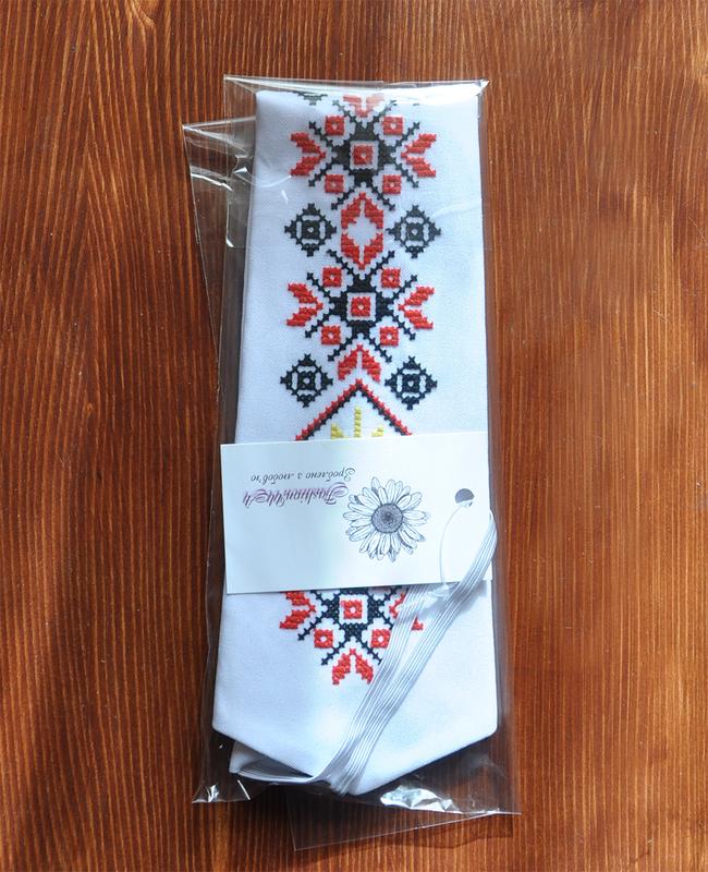 краватка чоловічий, білий, вишивка хрестиком, в національному стилі, на гумці, довжина 41 см , ширина 8 см, тканина-габардин. Вишиту краватку відмінно доповнить чоловічий костюм.