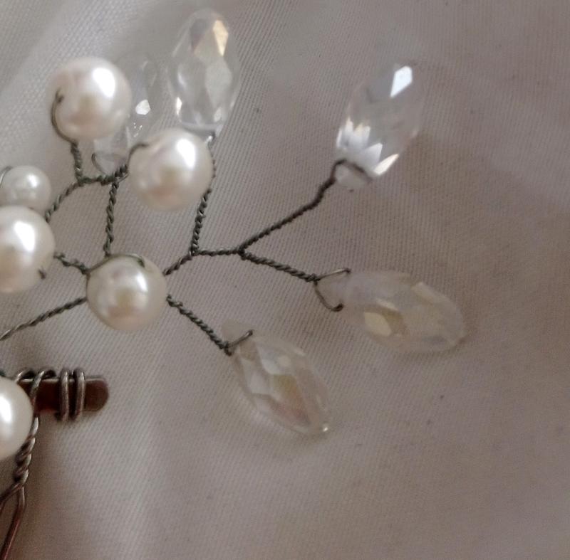 Гребінь ручної роботи. Основа срібного кольору. Буси білі, штучні перлини двох розмірів та штучні кристали. Ніжна та витончена прикраса.