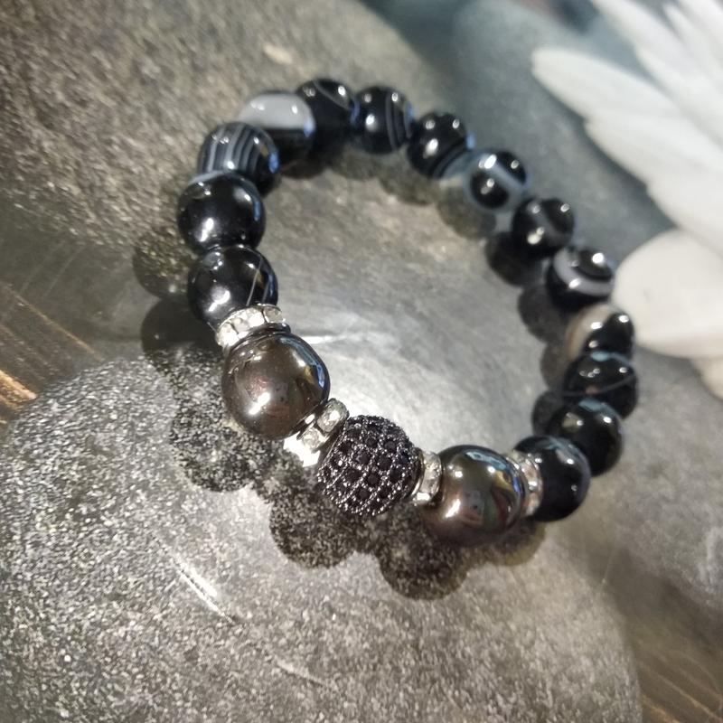 Браслет складається з натурального чорного агату та гематиту с металевою намистиною люкс, розмір намистин - 10 мм