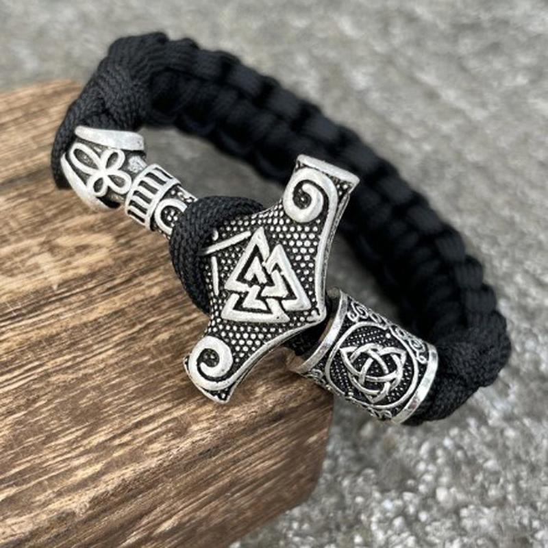 Браслет чоловічий із паракорду та сталі thor trinity black чорний із молотом тора