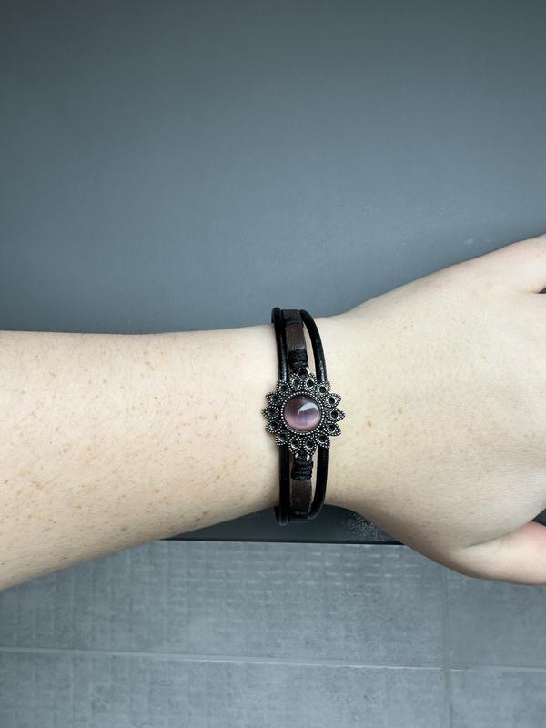 Шкіряний браслет коричнево чорний сонце з рожевим кварцом