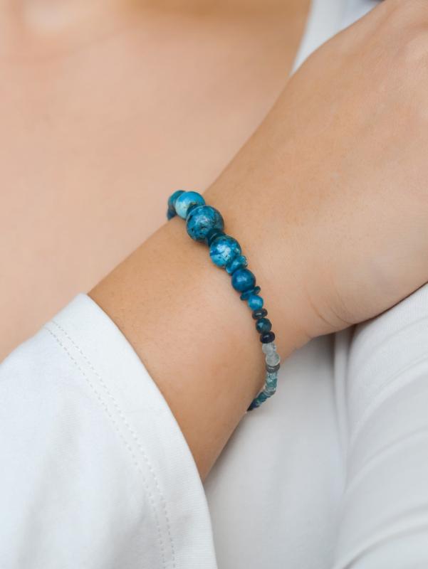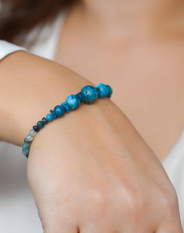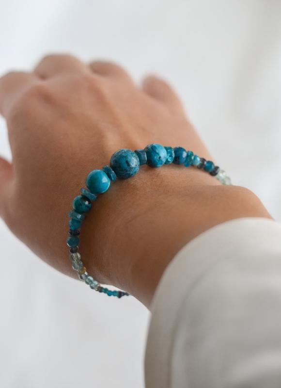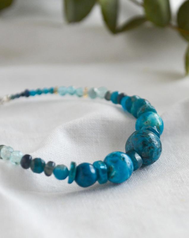 Браслет натуральний камінь Хризоколла, Апатит, Аквамарин фур-ра мед сплав колір срібло d-10-2мм+- L-18-23см