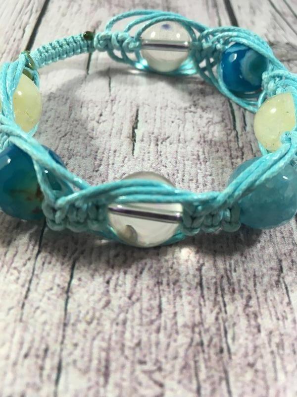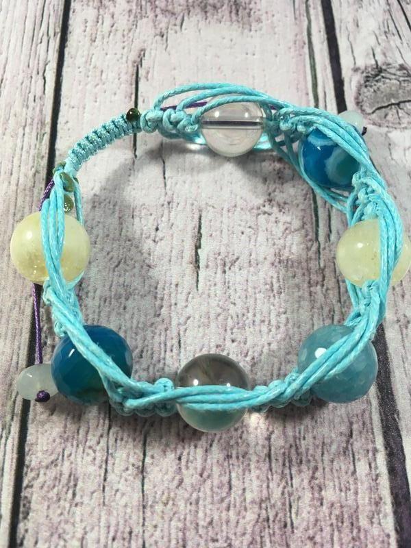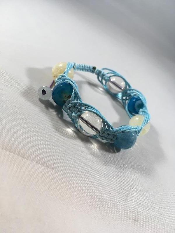 Намистини 14 мм - великі Намистини) Але вони не здаються масивними завдяки паутинчатому переплетення шнурів. Ах, як я люблю «драконівське оплітку» - цей вид шнурів відрізняється міцністю, але при цьому дуже красивий! У цьому потрійному переплетенні, як в гамаках, покояться намистини найчистішого гірського кришталю, ніжно-жовтого цитрину, тонованого кварцу і Агата. Особливу ніжність надають блакитні шнури, обплітають намистини. Затяжна застібка зручна і практична.