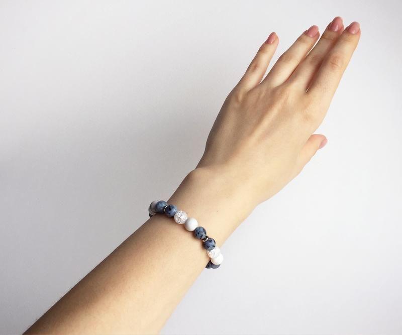 Ключові слова в описі цієї моделі прикраси — лаконічність і універсальність. Такий браслет буде ідеально поєднуватися з джинсовим стилем одягу. Кожна намистина блакитного кварцу і кахолонга має свій індивідуальний, неповторний малюнок. Саме тому вироби з цими каменями завжди унікальні. Кварц — Ø 8 мм Кахолонг — Ø 8 мм Гірський кришталь — Ø 8 мм Браслет зібраний на міцну й еластичну силіконову нитка.Розмір універсальний