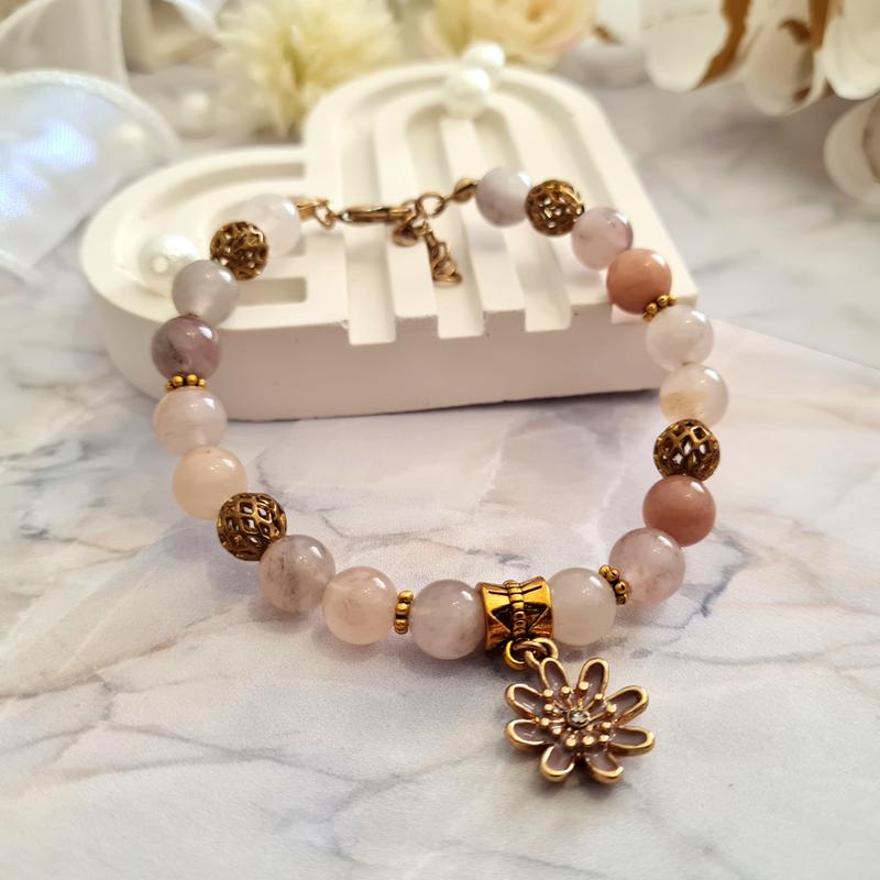 🏵️💫Браслет з гладких намистин натурального пудрово-бежевого агату. Підвіска ювелірної якості, з емаллю та цирконами. Застібка - карабін + подовжувальний ланцюжок. Фурнітура під старе золото. Розмір: довжина браслету 18 см + 3 см подовжувальний ланцюжок. Намистини 8 мм. Підвіска квітка - 1,3х1,3 см Состав: натуральний агат, сплав