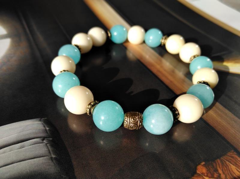 Від цього браслета віє теплом. Від нього неможливо відірвати погляд. Говлит, амазоніт і фурнітура під бронзу об'єдналися в гармонійний ансамбль, який прикрасить свою власницю. Діаметр намистин 10 мм. Довжина браслета 18-19 см. Додаткові характеристики: Колір: Бежевий Колір: Блакитний Камені / вставки: Амазоніт Камені / вставки: Говлит Матеріал: Камінь