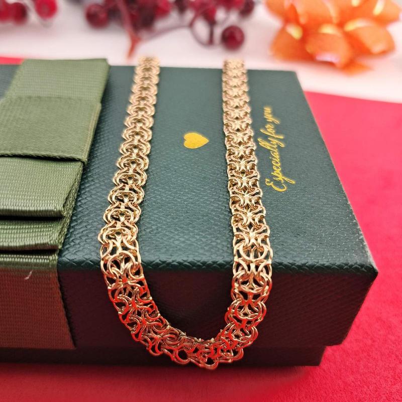 Золотий ланцюг. Цільнолитий. Плетіння рамзес. Виготовлено з червоного золота 585 проби. Сучасне плетіння. Ціна від виробника. Вага виробу: 4,99 гр Золото - червоне, цільнолите Довжина - 17 см Ширина -- 6 мм Стан - новий Наявність бірки, проби - так Браслет в наявності Матеріал - золото 585*, виріб апробовано в пробірній службі України По Україні відправляємо новю поштою, з мінімальною передплатою 200 грн, решта наложка